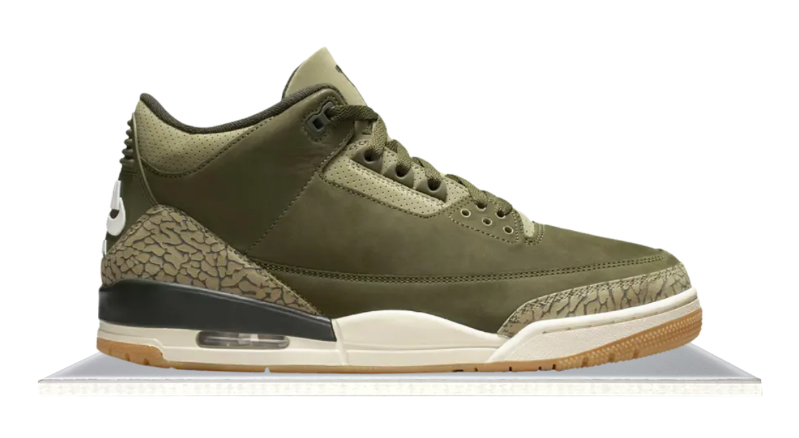 The Air Jordan 3 Family Affair features an olive nubuck upper with tonal elephant print, Jumpman tongue branding, and Nike Air on the heel. An off-white midsole with visible Air and a gum outsole complete the clean, refined look.