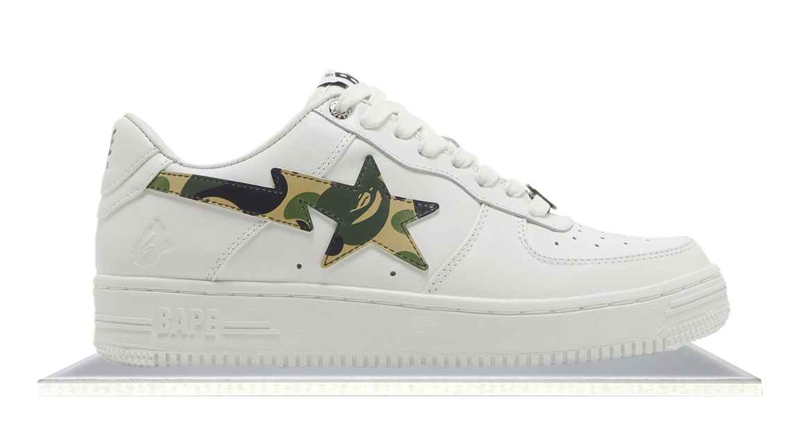The Bape Sta in a white and "Camo Green" color combo with white on the base and a Green camo Bape motif star on the side. A small Bape motif on the lateral heel also appears.