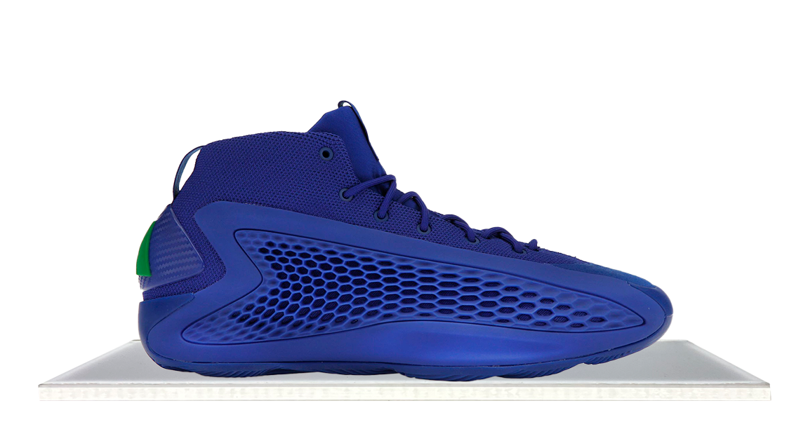 The adidas AE 1 Velocity Blue, a collab with NBA player Anthony Edwards, features a bold design with Lime Green accents on a Velocity Blue base. Its midsole combines LightStrike foam and Boost cushioning for lightweight energy return. The upper, made of durable textile, includes TPU support Wings with a honeycomb-like design for stability.
