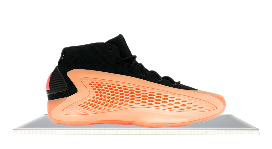 The adidas AE 1 With Love, a collaboration with Anthony Edwards, debuts in black knit textile with an Acid Orange TPU support cage for breathability. Boost and LightStrike tech ensure comfort, while the rubber outsole provides traction. The standout feature is the TPU overlay, adding a unique touch to the Georgia peach-inspired upper.