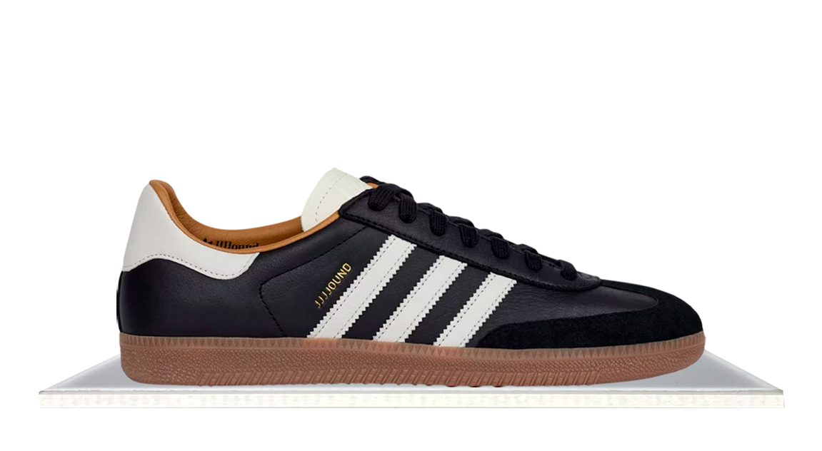The JJJJound x adidas Samba OG 'Black' showcases a premium rendition of the classic silhouette. Crafted in Germany, it boasts a black leather upper with tonal suede overlays. Gold foil lettering adds a touch of sophistication, while a gum rubber sole unit offers traction and durability.