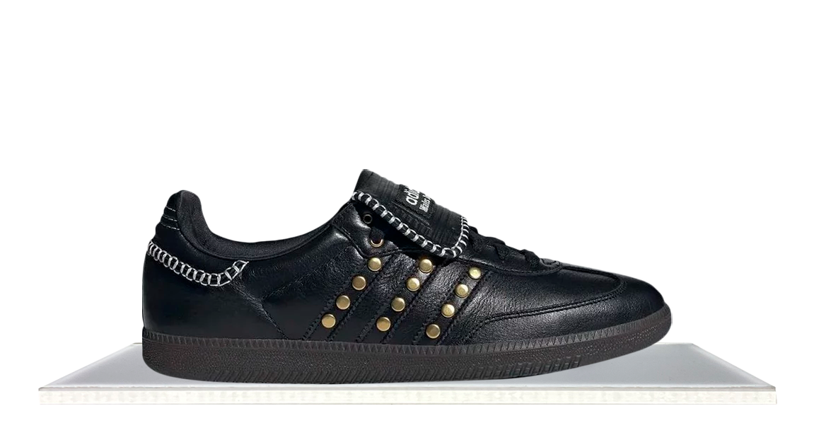 Part of the 'Studded Pack,' the Wales Bonner x adidas Samba 'Black' revamps the iconic silhouette with a luxe touch. Its black leather upper, satin lining, and low-cut padded collar exude sophistication. Metallic studs adorn the three-stripes, while white deco stitching highlights the back tab and fold-over tongue, featuring a co-branded woven label. Completing the look is a low-profile rubber cupsole.