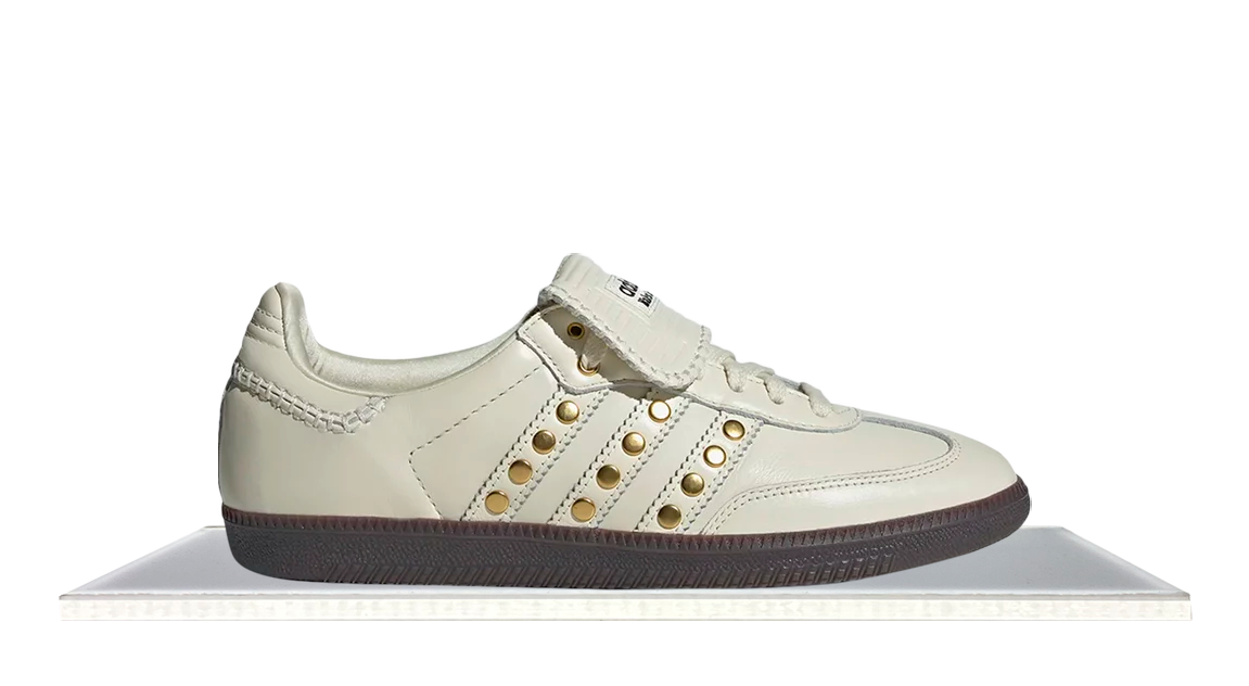 From the exclusive 'Studded Pack,' the Wales Bonner x adidas Samba 'Cream' showcases a luxurious aesthetic. Its leather upper, satin lining, and metallic stud-adorned three-stripes reflect Wales Bonner's Fall/Winter 2023 collection motif. Deco stitching accents the heel tab and fold-over tongue, while dual branding embellishes the sockliner and woven tongue tag. The sneaker is grounded by a sturdy rubber cupsole.
