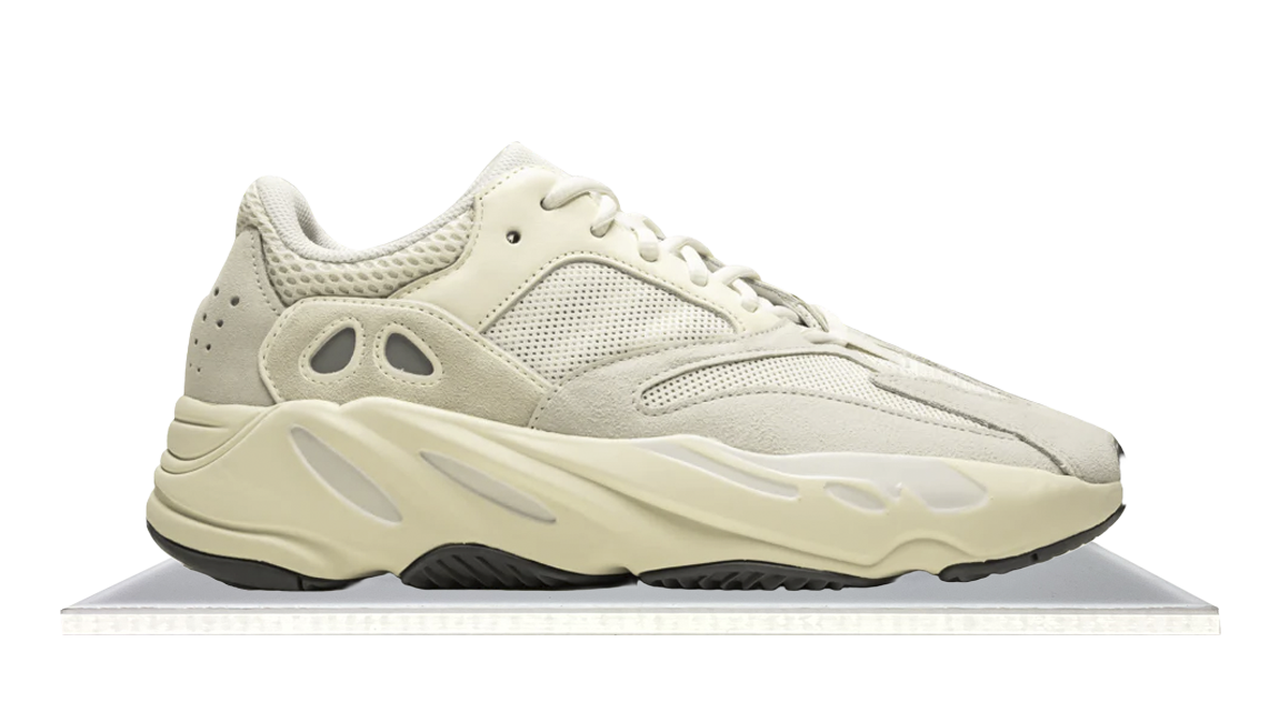 The Yeezy 700 Analog features a beige upper with grey accents, three grey adidas stripes, beige midsole plus grey accents, and a black outsole. This pair first released in 2019, and was reintroduced in 2023.