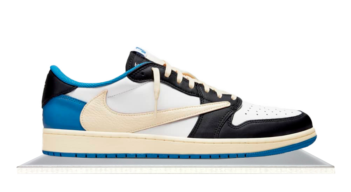 The Air Jordan 1 Low Travis Scott x Fragment is a collaborative take on the Air Jordan 1 Low between La Flame and Japanese designer Hiroshi Fujiwara through his company Fragment. The sneaker draws inspiration from the 1985 sample “Air Jordan 1 Royal Press” with its white and blue leather. Additional details include Travis Scott's signature reversed Nike swoosh and the Fragment logo on the heel.