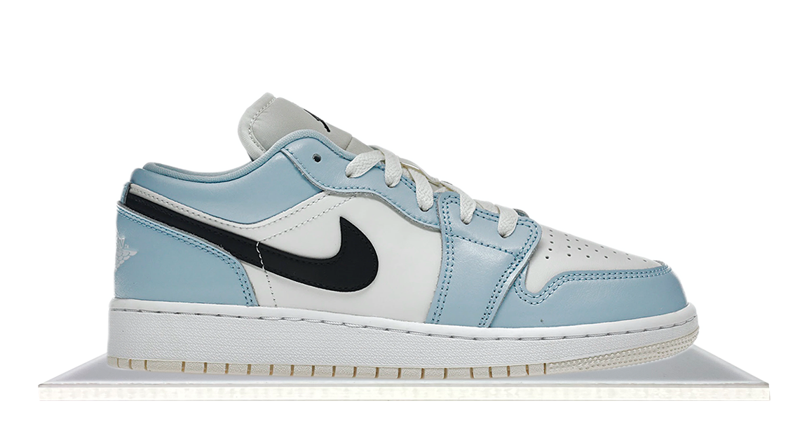 The Air Jordan 1 Low in an ice blue colorway, with a black swoosh and a off-white sole.