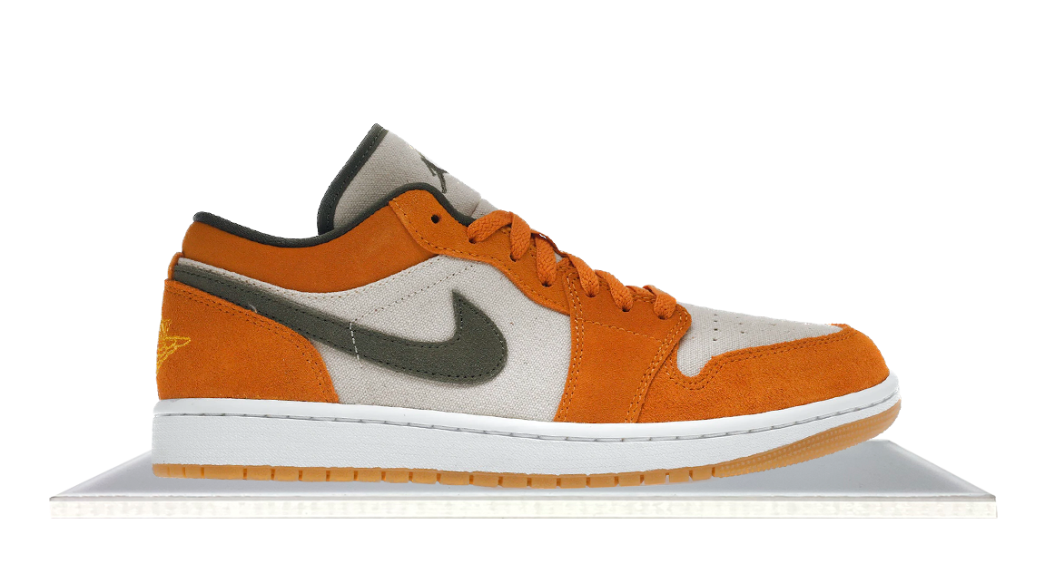 The Air Jordan 1 Low Light Curry features a beige canvas upper contrasted by orange layers. Its upper is attached to a white midsole and a rubber outsole.