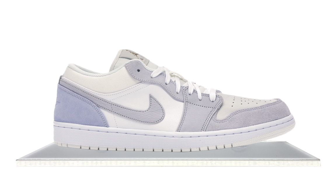 The Air Jordan 1 Low Paris with a pastel-like vibe, featuring a grey upper with light blue shades throughout. The shoe is constructed from fabrics such as suede, smooth leather, and mesh on the upper and then rubber on the sole unit.