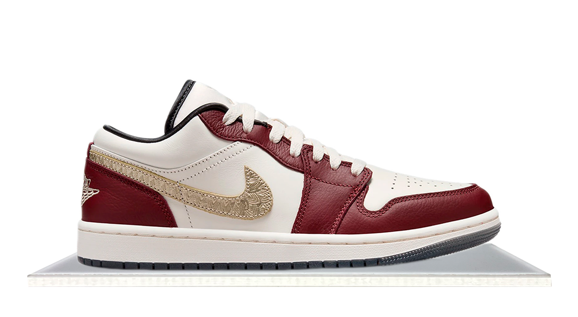 Step into luxury with the Air Jordan 1 Low Year of the Dragon (2024). Premium leather in Sail provides a sophisticated backdrop, while Dark Team Red accents create a bold contrast. The metallic gold Jumpman logo and intricate Swoosh pattern add a touch of opulence, accompanied by a floral-themed silver hangtag. Sail midsole and grey outsole complete the refined look.