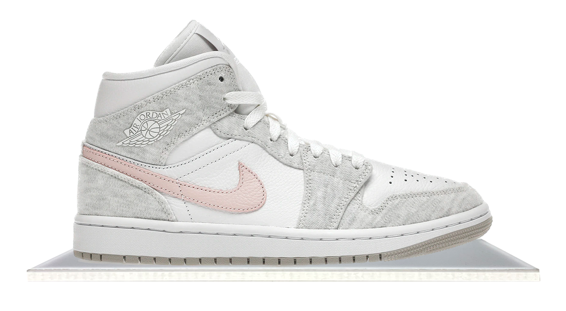 The Air Jordan 1 Mid SE Light Iron Ore W has a light grey outsole, with a bright white midsole on top. A mixture of pebbled leather and canvas-like fabric is used for the rest of the body. Grey canvas panels are carefully placed on the sides, surrounding the pink leather Nike swoosh symbol.