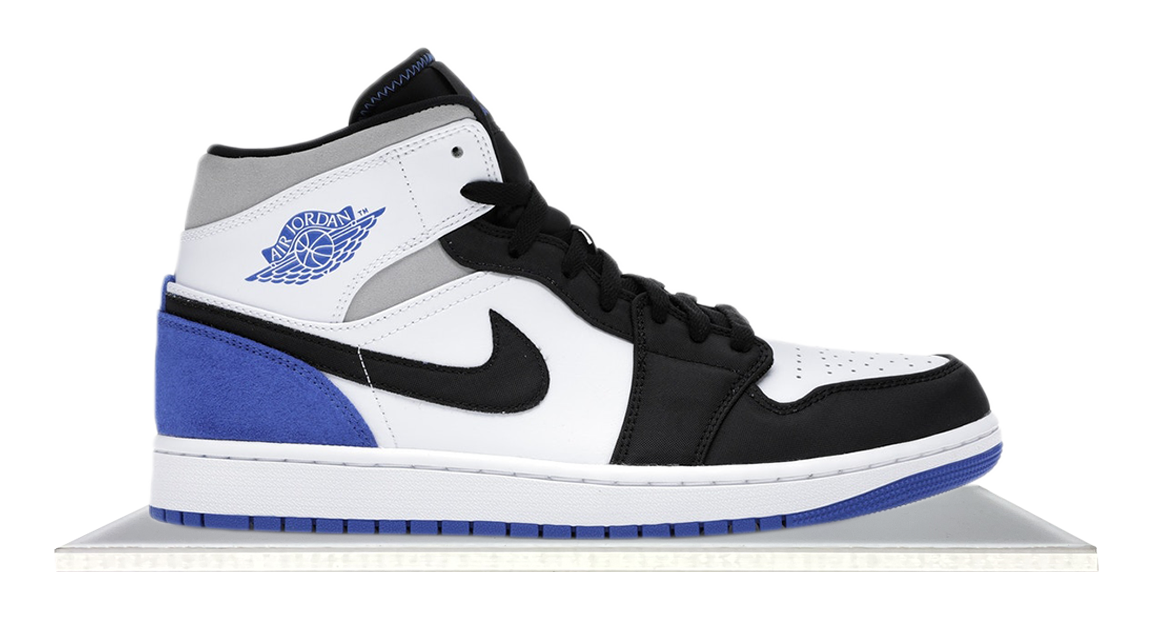 The Air Jordan 1 Mid Union Royal bears some resemblance to the Air Jordan 1 Union LA Black Toe. It features a white leather base with tones of blue, grey, and black highlighting details throughout the sneaker.
