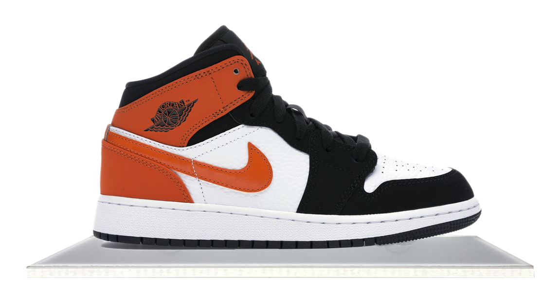 Inspired by Michael Jordan's iconic backboard-shattering dunk, the Air Jordan 1 Mid Shattered Backboard boasts a limited edition Black/White-Starfish colorway. The "Air Jordan" branding graces the upper sides, while the bold orange Swoosh logo provides a striking contrast. A shattered backboard graphic on the insole adds a finishing touch.