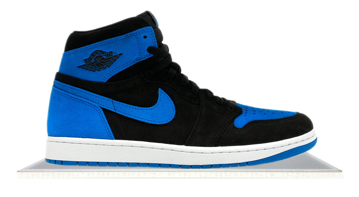 The Air Jordan 1 High Royal Reimagined brings back the iconic 'Royal Blue' colorway in style. With a premium suede upper alternating between jet-black and royal-blue, it features a woven Nike Air logo on the tongue and the Ball and Wings logo on the sides. The white foam midsole with a heel Air unit provides comfort and style.