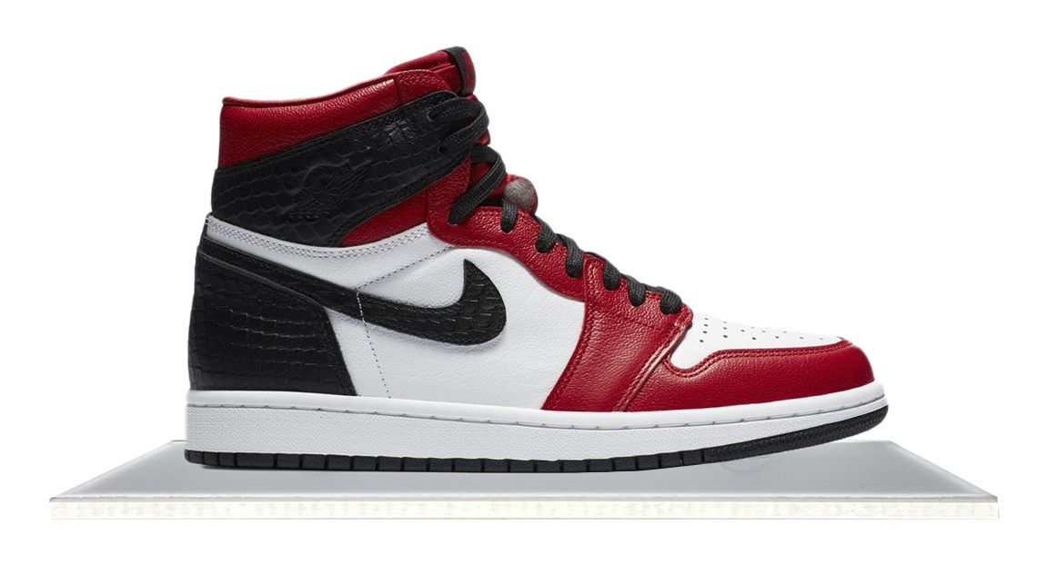 The Air Jordan 1 High in a Chicago colorway, but substitutes a red leather heel with a black snakeskin construction with snakeskin also appearing on the swoosh and ankle collar.