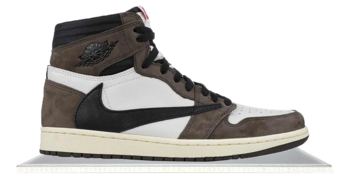The Air Jordan 1 High Travis Scott is a high-top version of the iconic Air Jordan 1 sneaker. It is a collaboration between Air Jordan and American rapper Travis Scott. The shoe features a combination of brown, white and black leather on the upper, with a black swoosh and Cactus Jack branding on the heel and tongue. The sneaker also features a creamy white midsole and a mocha brown outsole. This version of Air Jordan 1 is considered a highly sought-after release among sneaker enthusiasts and fans of both brands, known for its unique design and premium materials.