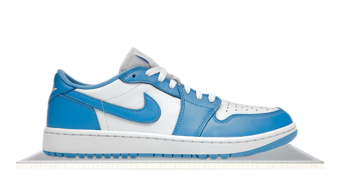 The Air Jordan 1 Low Golf "UNC" is originally a golf shoe, and comes with the popular UNC color scheme in a light and fresh university blue on the overlays, swoosh and sole, with a white base in leather.