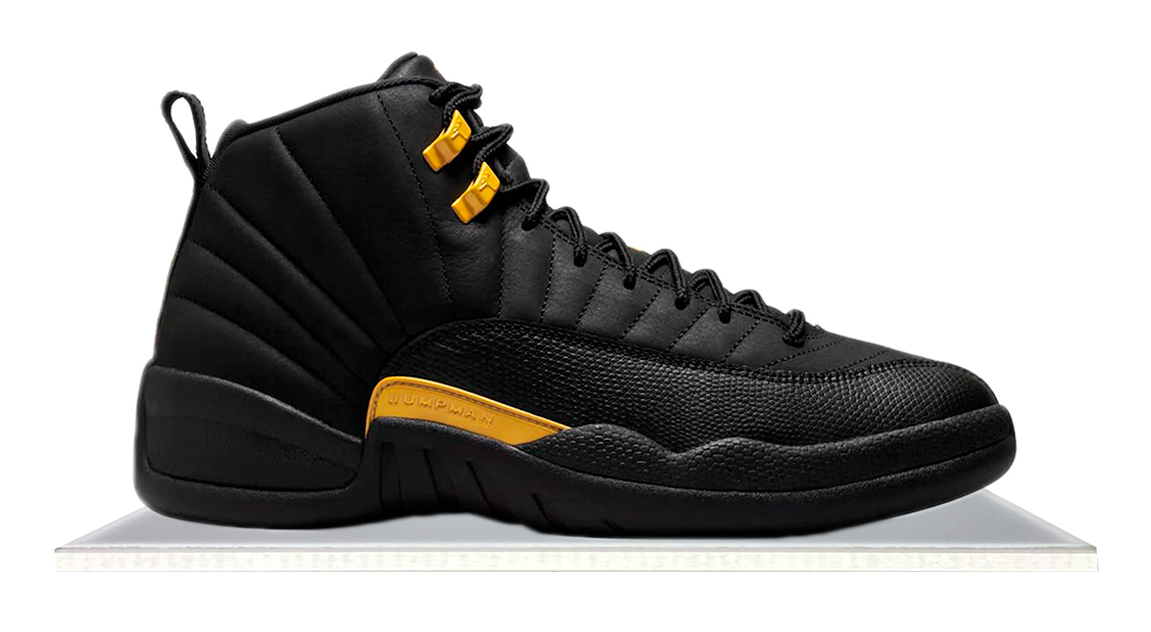 Celebrating 25 years of Jordan 12. This time with a grained leather upper in black, black snakeskin mudguard, gold Jumpman details and eyelets witch finishes the “Taxi” look.