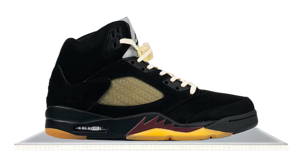 The A Ma Maniére x Air Jordan 5 Dusk presents a luxurious collaboration, featuring a regal suede upper and unique A Ma Maniére monogram pattern in place of the iconic AJ5 cage. With badging on the tongue and outsole, this release showcases the brand's distinctive style and attention to detail.