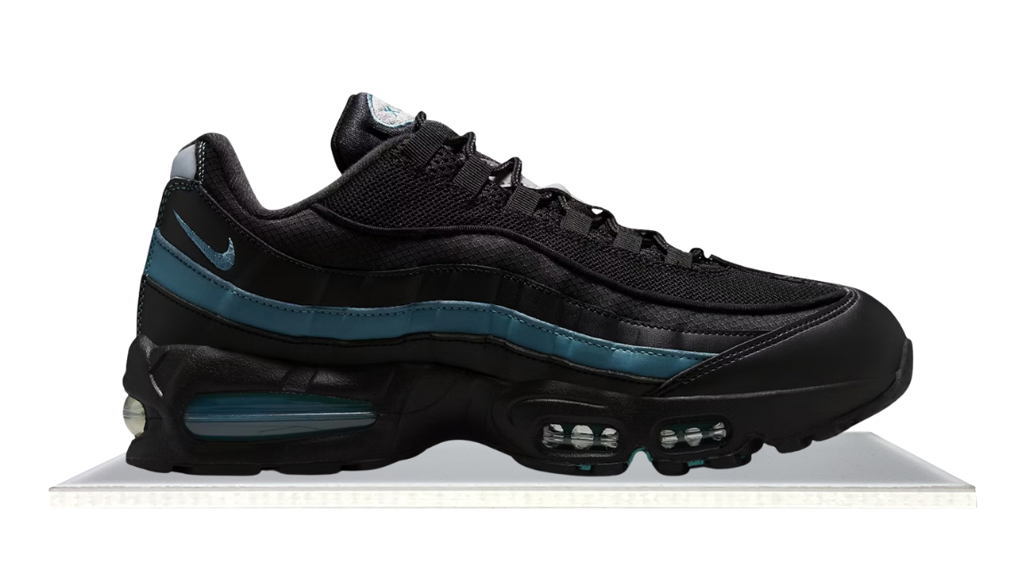The Air Max 95 Big Bubble Smoky Blue Black updates the iconic silhouette with a sleek, everyday-ready look. A black base is contrasted by vibrant aqua accents and reflective silver details, while signature branding and visible Air units complete this bold tribute to 30 years of Air Max innovation.