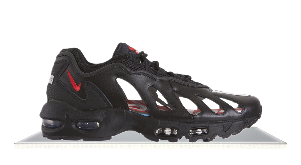 The Nike Air Max 96 Supreme “Black” brings a bold edge to the retro silhouette, merging street-ready style with classic Air Max tech. Featuring a mostly black upper, this version is accented by sharp hits of Speed Red on the side Swoosh and tongue, with white panels adding a subtle contrast on the toe and lateral side. Underfoot, visible Air units cushion each step, supported by a black rubber sole built for grip and durability.