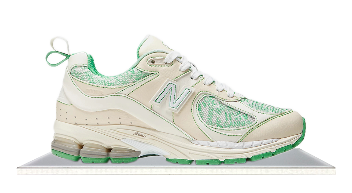 New Balance and Ganni coming together. Featuring a recycled mesh base covered with the GANNI monogram in green matching the inner lining.