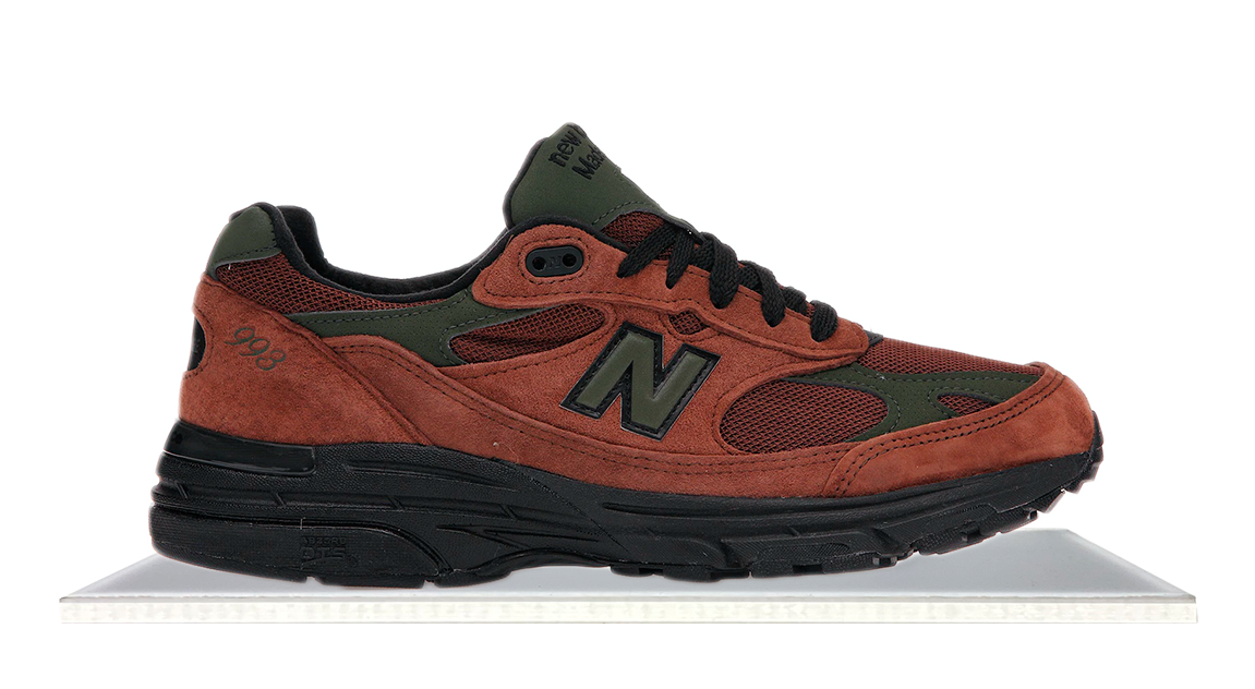 The New Balance 993 Aimé Leon Dore Brown features a brown mesh upper with brown premium pig suede and dark green tumbled leather overlays. At the base, a black responsive midsole and rubber outsole is geared for daily wear. Aimé Leon Dore branding on the heels and inserts add a custom feel.