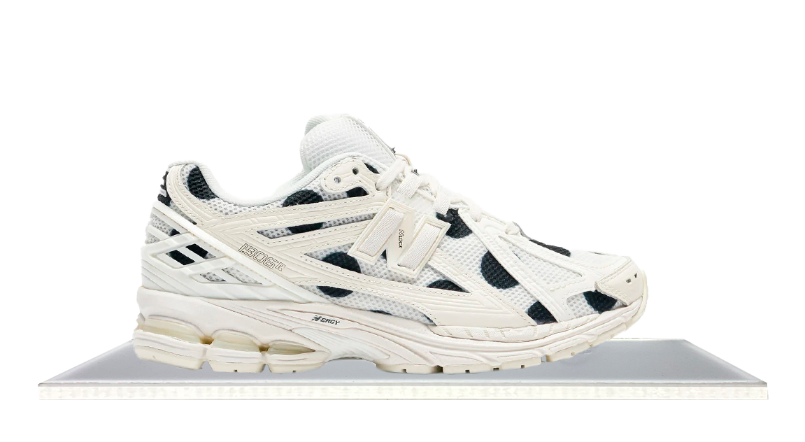 The New Balance 1906R blends heritage with modern design, featuring a shock-absorbing N-ergy outsole, Stability Web for arch support, and ACTEVA LITE midsole. This version sports an all-white colorway with black polka dots for a stylish touch.
