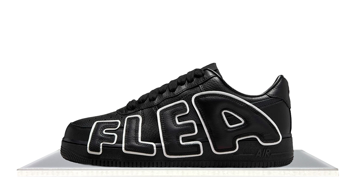 The 2024 reissue of the Cactus Plant Flea Market x Nike Air Force 1 Low Premium 'Black' highlights oversized branding from the Air More Uptempo. The black tumbled leather upper features reflective-outlined lettering, with 'FLEA' on the left shoe and 'AIR' on the right. A matching black rubber cupsole with encapsulated Air-sole cushioning completes the design.
