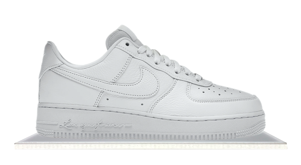 A new silhouette takes on the classic “Triple White” Air Force. The upper consists of premium tumbled leather, and details such as embroidered NOCTA branding on the heel and insoles. On the midsole the classic “AIR” has been replaced by “Love You Forever” written in cursive, and the stars has been replaced with hearts as well.