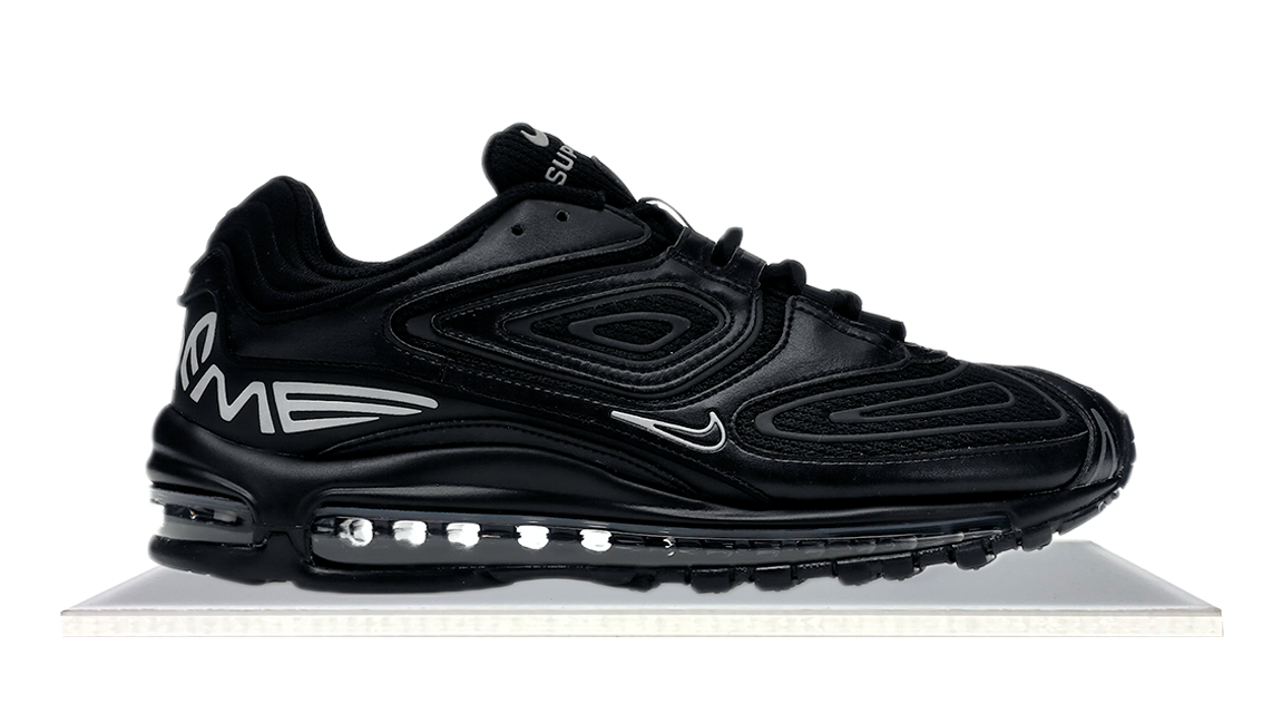 Part of the Supreme F/W 2022 collection, a classic and underated Air Max got a new look - The Air Max 98. In an all black colorway it features a mesh upper with leather overlays. Grey reflective details on the side of the shoe, grey “Supreme” branding on the tongue, while a TL logo is added to the heel.