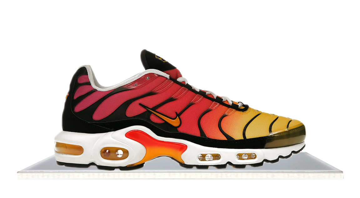 The Nike Air Max Plus Yellow Pink Gradient features a vibrant color transition from yellow to pink. It boasts Tuned Air technology for cushioning, a breathable mesh upper with synthetic overlays, and a customizable lacing system. The rubber outsole ensures traction, and the iconic Nike Swoosh and Air Max branding complete the look.