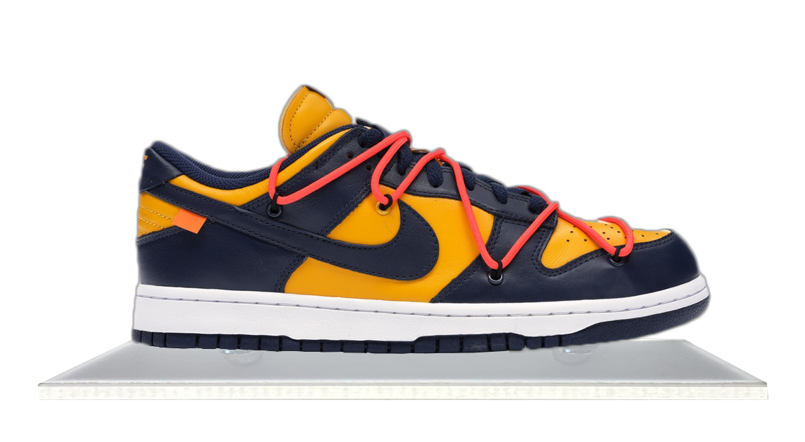 Designed by the late great Virgil Abloh, the Dunk Low Off-White Michigan. When Nike revealed the original 7 colorways of the dunk low in their Nike College Color's Program, 7 colleges were represented each given a dunk with their signature color. Michigan was one of them. A dunk with a Virgil twist and a lot of history.