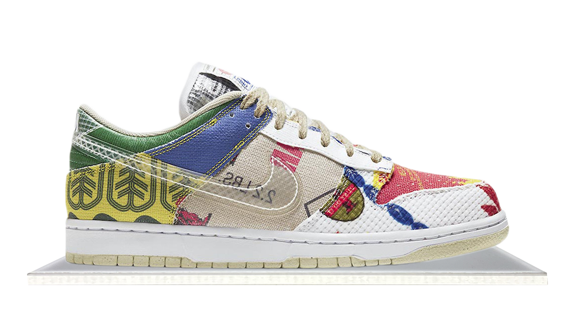 An eye-catching design has been made on this Dunk Low featuring a colorful upper in different sorts of fabrics. A collectors shoe with a lot of history.