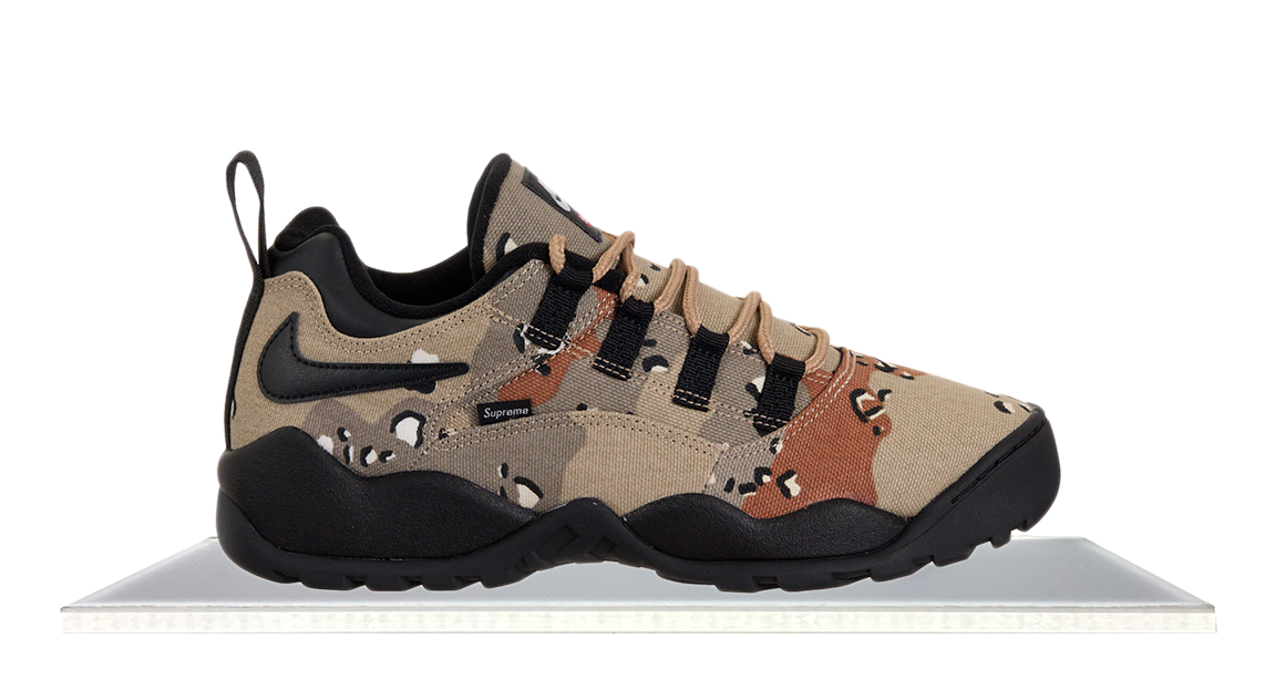 The Supreme x Nike Darwin Low SB 'Desert Camo' revives a '90s outdoor basketball shoe with a fresh twist. Crafted with an all desert camo canvas upper and black accents, it features co-branded details like the tongue patch and Supreme tag. Finished with a black polyurethane midsole, this iteration pays homage to the original while adding contemporary flair.