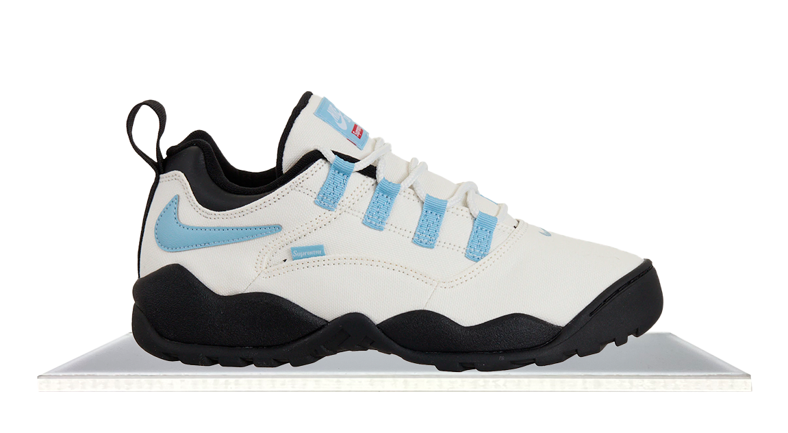 The Supreme x Nike Darwin Low SB 'Sail' revives a '90s outdoor basketball shoe with a fresh twist. Crafted with an off-white canvas upper and Polar Blue accents, it features co-branded details like the tongue patch and Supreme tag. Finished with a black polyurethane midsole, this iteration pays homage to the original while adding contemporary flair.