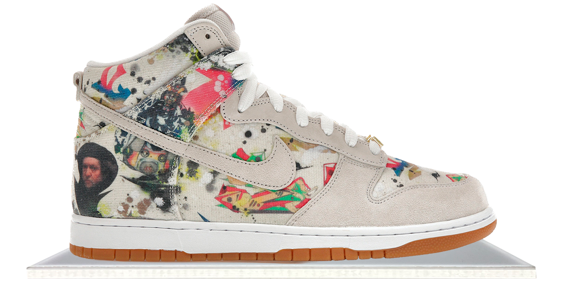 Another exciting Nike x Supreme SB Dunk collaboration. This time inspired by one of the most influential artists in New York, Rammellzee. As often seen with Rammellzee the print combines a variety of elements including science fiction, magical realism, and Afrocentrism. It is contrasted with an all beige base and a gum outsole.