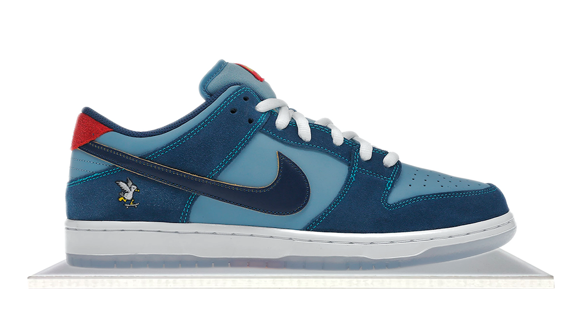 Another special SB Dunk has arrived. The SB Dunk Low Why So Sad, it's featuring a palet of different blue colors. The upper is a nubuck leather base with a lighter blue, while the suede overlays is in a darker blue. On the heel, a chicken riding a skateboard appears. The “Why So Sad?” is part of raising awareness of mental health issues and suicide prevention.