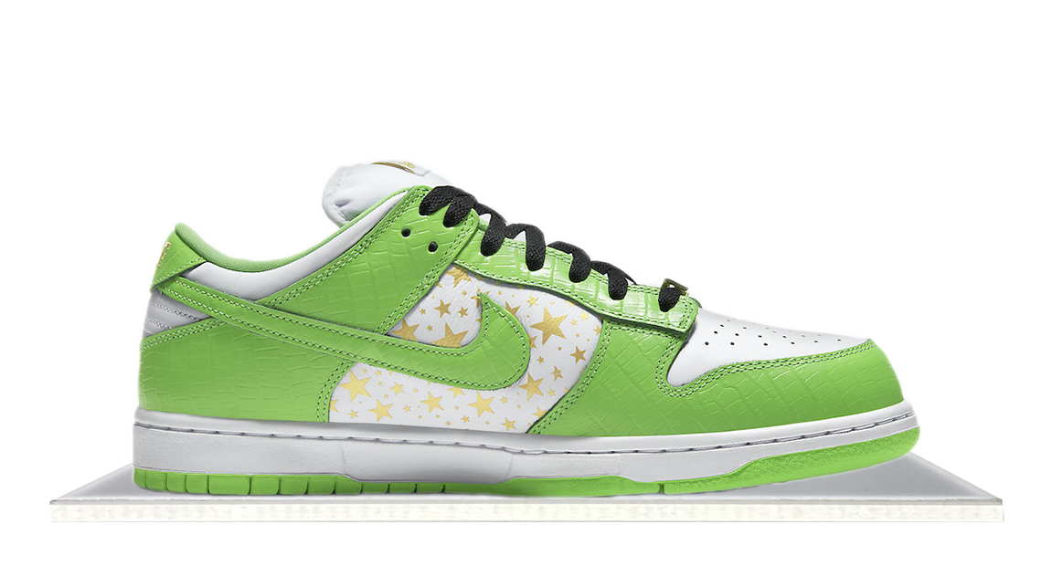 Supreme and Nike with a collaborative take on the SB Dunk Low. Four colorways were released with a white leather base and overlays in faux croc skin. This time in a "mean green" colorway. Additional details includes stars on the side of each sneaker and a gold Supreme tag on the laces.Supreme and Nike with a collaborative take on the SB Dunk Low. Four colorways were released with a white leather base and overlays in faux croc skin. This time in a "mean green" colorway.