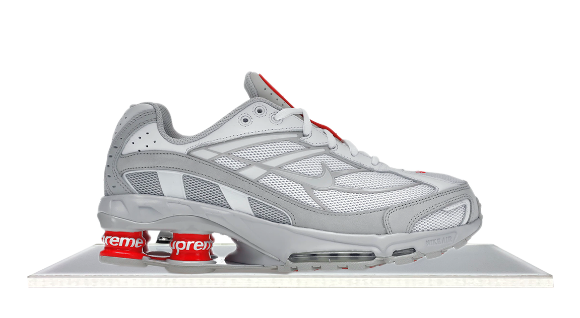The Nike Shox Ride 2 Supreme White features a design with white mesh, light grey suede, and leather construction. Reflective detailing and webbed paneling enhance its aesthetic, while DURAPLUSH tongues and sock liners ensure comfort. Completing the look are red Nike Shox units with Supreme branding under the heel.