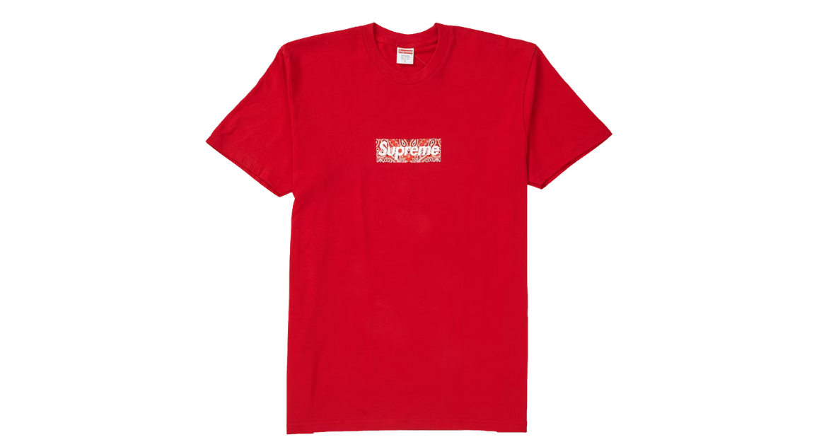 The Supreme Bandana Box Logo Tee Red (FW19) reimagines the iconic box logo with a bold bandana print. Released on December 19, 2019, this standout red tee from Supreme’s FW19 collection blends streetwear heritage with classic paisley flair.