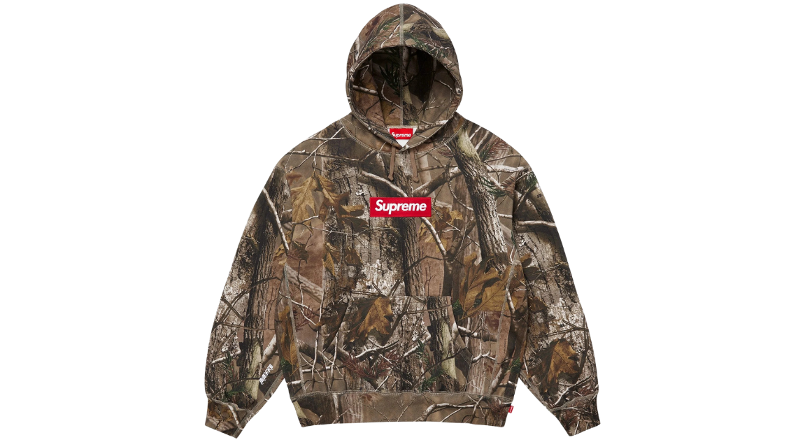 The Supreme Box Logo Hoodie Realtree® Camo (FW25). A bold twist on a streetwear classic with its signature box logo set against a rugged real tree camouflage pattern that brings standout attitude to any outfit.
