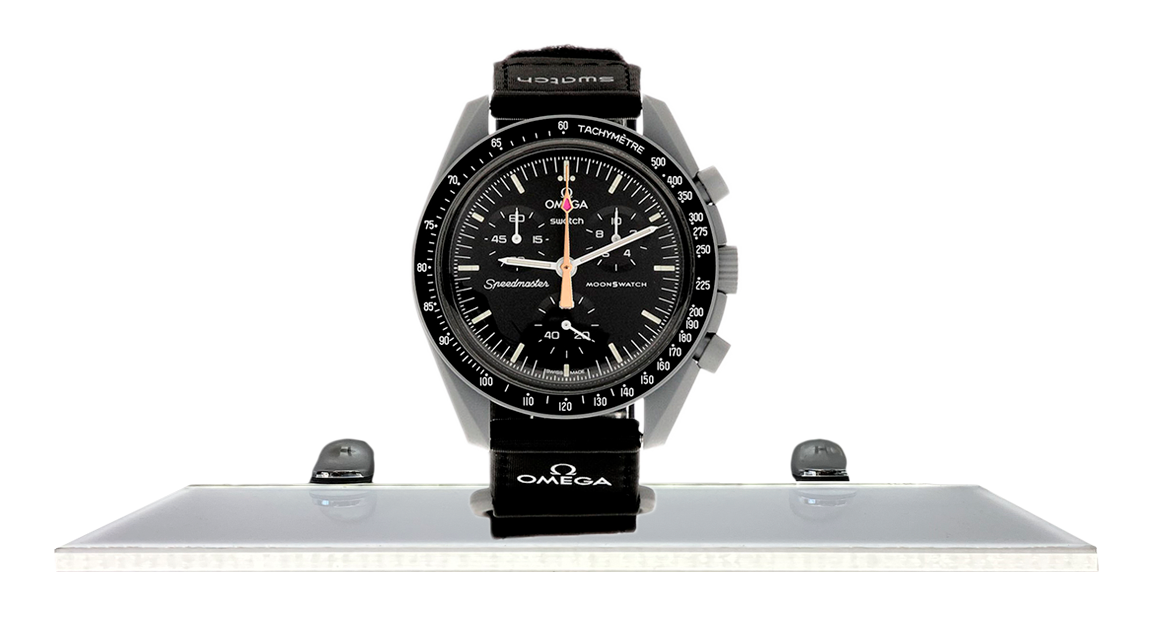 The Omega X Swatch MoonSwatch is one of the most surprising and intriguing watch releases of 2022. This is one of more than 15 watches released and is one of the most sought-after of them all. The “Mission to Moonshine Gold Pink” edition features a combination of black and grey tones, and has a black velcro strap. All writing and details are in grey tones. The chronograph subdial hands and seconds hand are in grey and then one in a gold/pink.