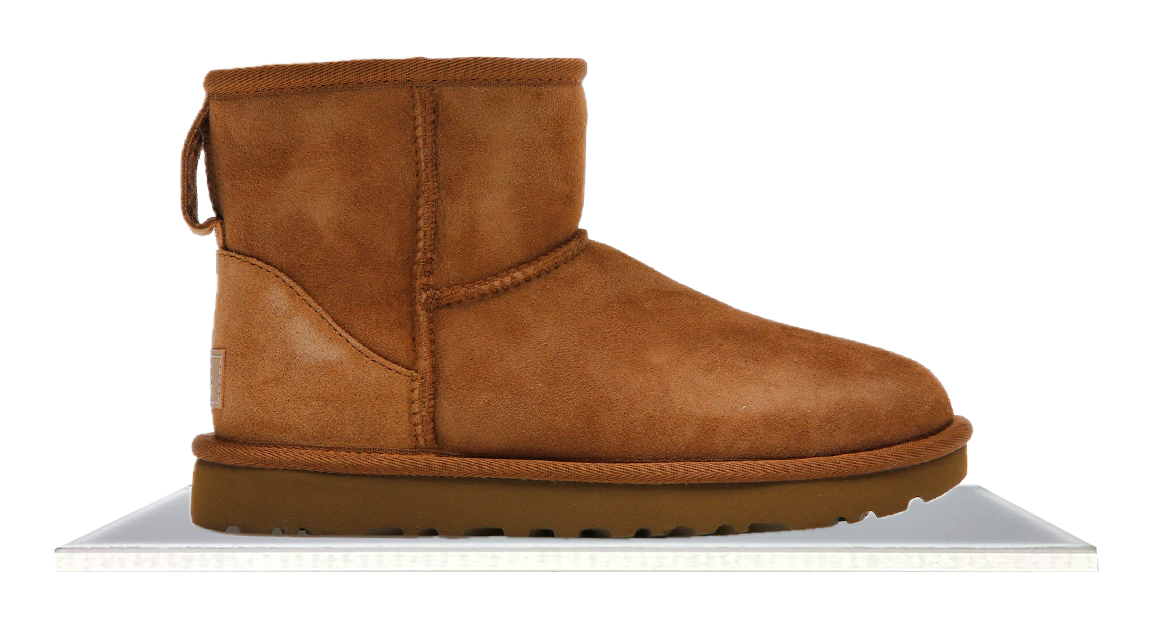 The UGG Classic Mini II Boot Chestnut for women (W) stands out in a rich chestnut hue. Crafted with water-repellant suede, it features a cozy sheepskin-lined interior in a contrasting tone. The 17mm sheepskin insole ensures comfort, while UGG branding on the heel tag, polyester binding, and overclock stitch detailing enhance its appeal. The Treadlite UGG sole with multidirectional treads ensures reliable traction.
