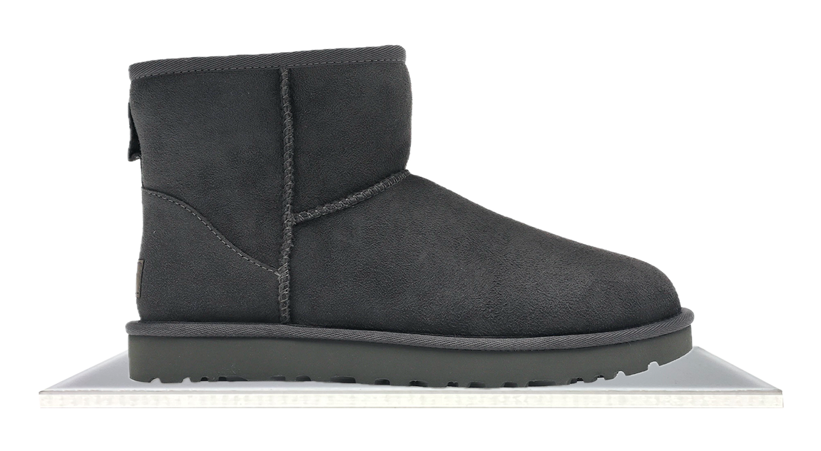 The UGG Classic Mini II Boot Grey for women (W) blends soft sheepskin with water-resistant materials. Treated for stain and water resistance, this model features a plush shearling lining for comfort. The lightweight Treadlite sole provides cushioning and traction. With a gray suede exterior, UGGPure wool insole, foam footbed, and a rear-woven label with the brand logo, it exudes style and functionality.