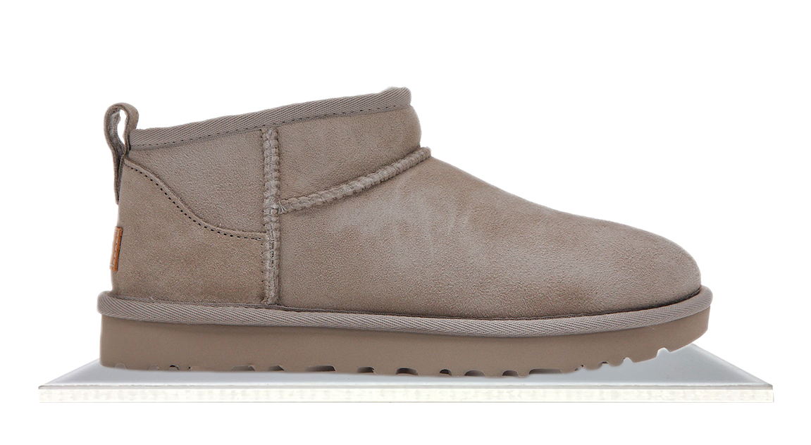 The UGG Classic Ultra Mini Boot, dressed in a grey "Goat" colorway. The UGG Classic Ultra Mini Boot features a Twinface sheepskin upper, a Suede heel counter with a rear pull tab, upcycled wool, a lyocell insole, a Foam footbed, and a Treadlite outsole.