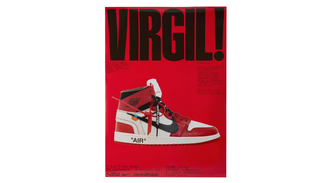 The Virgil Abloh Archive “Air Jordan 1 High Chicago Off-White” Poster pays tribute to the first major European exhibition honoring Virgil Abloh. Featuring the iconic Off-White Jordan 1 design with Grand Palais detailing, this collectible poster celebrates the visionary designer’s cultural impact.